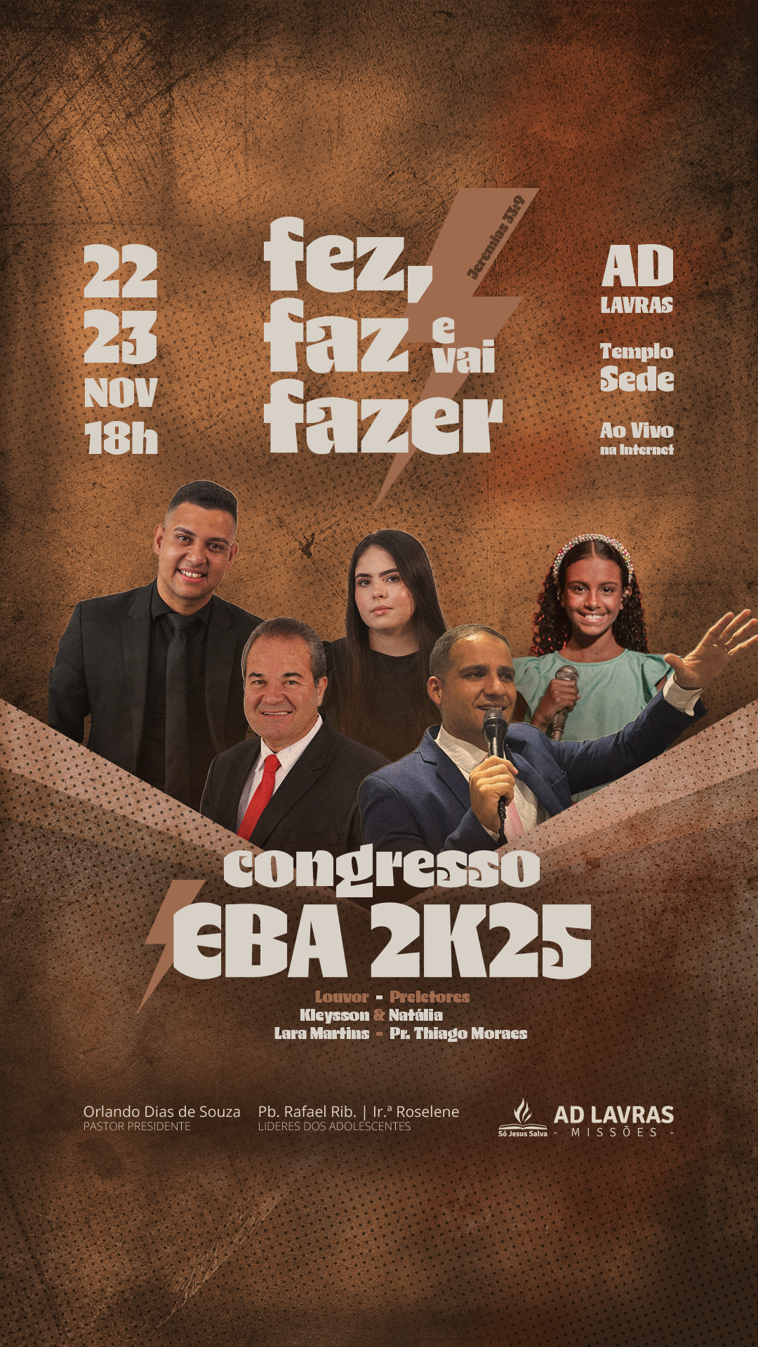 Acontece nos dias 22 e 23 de novembro de 2025, às 18h no Templo Sede da AD Lavras, a 25ª edição do Congresso EBA, que reunirá os adolescentes das congregações de Lavras e do Campo de Evangelização da nossa Igreja.