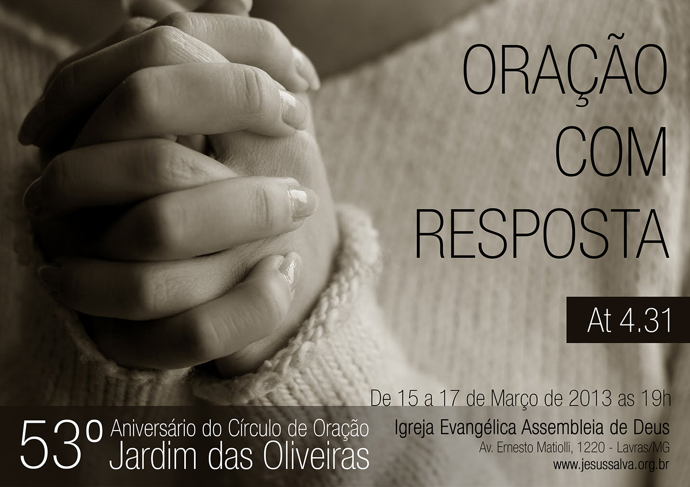 A Igreja Evangélica Assembleia de Deus (Missões) do campo de Lavras/MG e as irmãs do Círculo de Oração Jardim das Oliveiras têm a honra de convidar você e sua família para participar das Festividades do 53º Aniversário do Círculo de Oração Jardim das Oliveiras, a realizar-se nos dias 15, 16 e 17 de Março de 2013, sob o tema "Oração com resposta!" (At 4.31).