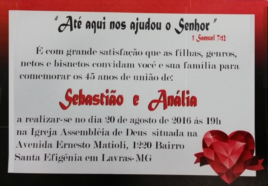 No próximo final de semana, dia 20 de agosto de 2016, será realizado um culto em ação de graças pelos 45 anos de união entre o Irmão Sebastião e a Irmã Anália.