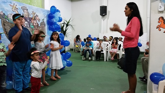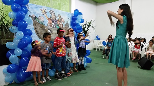 Mas elas se divertiram quando a Imã Cláudia juntamente com os bonecos fantoches contaram sobre a vida de Noé e de sua família, que com o coração voltado para Deus em bondade e obediência, construiu uma grande arca a fim de abrigar um casal de cada espécie de bichos durante o grande dilúvio.