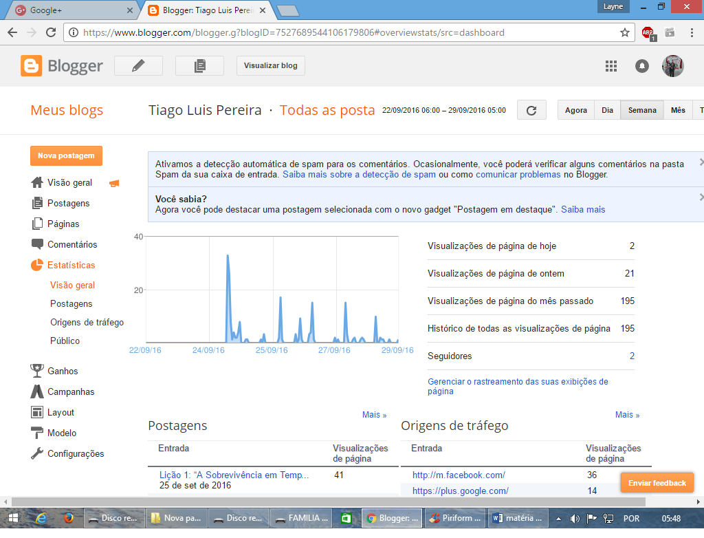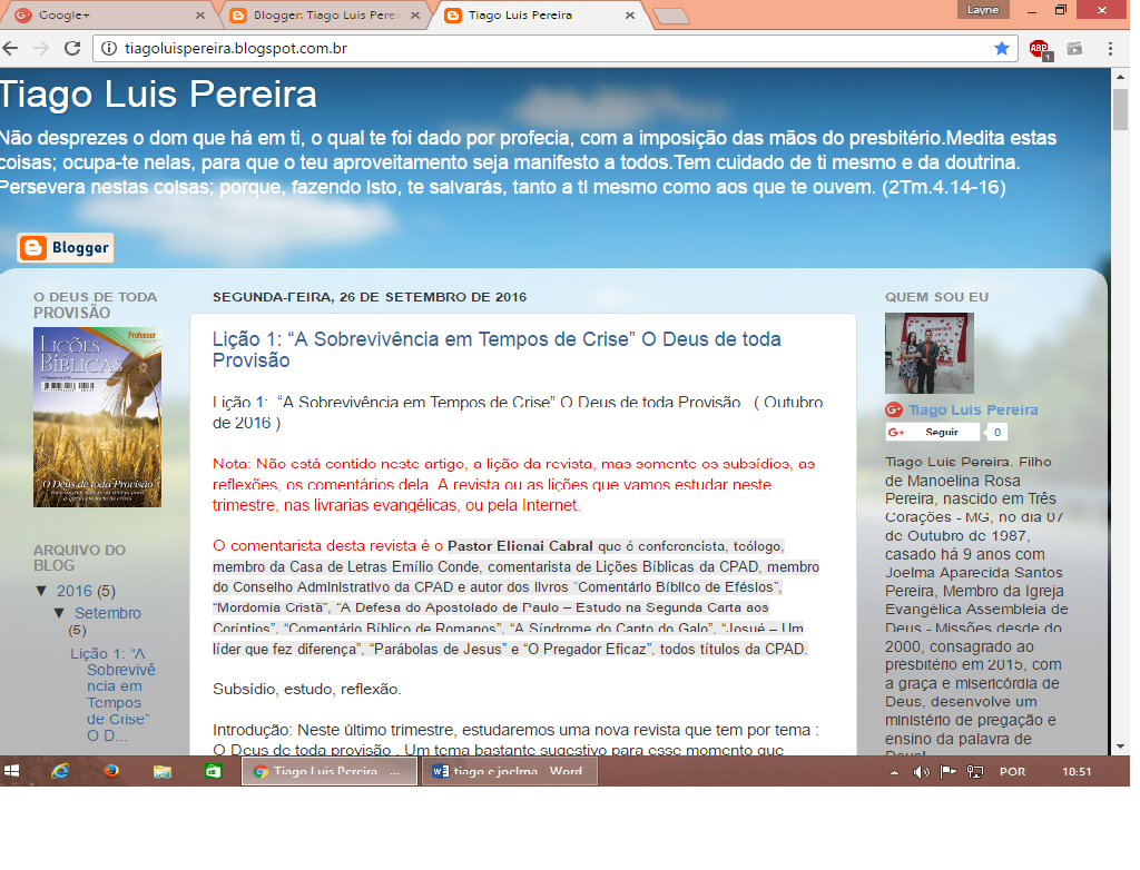 Escrito por Raniely Crispim de PaivaNo dia 24/09/16 (sábado), o Pb. Tiago Luis Pereira, que é professor da Escola Dominical, classe dos adultos, criou um blog na internet motivado pela lição da Escola Dominical do dia 18/09/16, onde foi abordado o tema: “ A Evangelização na Era digital”. Em seu blog juntamente com seu canal no youtube, nosso irmão postará semanalmente comentários da EBD, reflexões e mensagens que Deus tem lhe dado, até a presente data o blog já teve mais de 190 visualizações.