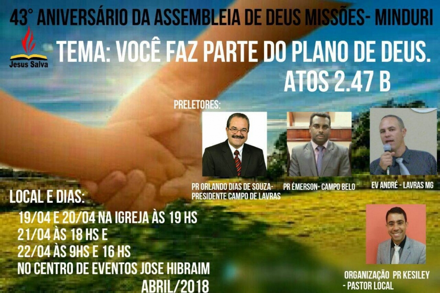 Escrito por Heider AlvarengaA Igreja Assembleia de Deus em Minduri/MG convida a todos a participarem das festividades em comemoração dos 43 anos da igreja naquela cidade. O evento ocorrerá nos dias 19 a 22 de abril conforme programação a seguir.