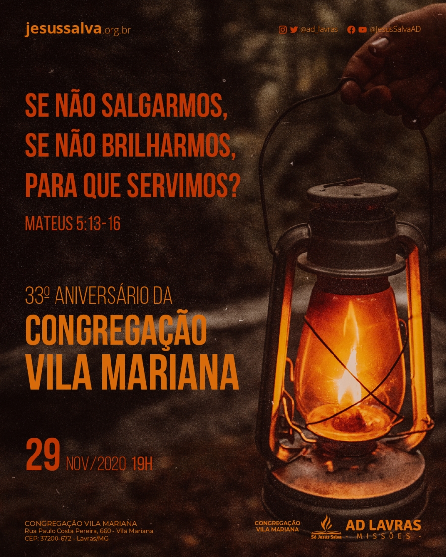 Escrito por Heider AlvarengaA festividade em comemoração ao 33º Aniversário da Congregação Vila Mariana será realizada no dia 29 de novembro de 2020, às 19h, na Congregação Vila Mariana da AD Lavras (Rua Paulo Costa Pereira, 660 - Vila Mariana - CEP: 37200-672).
