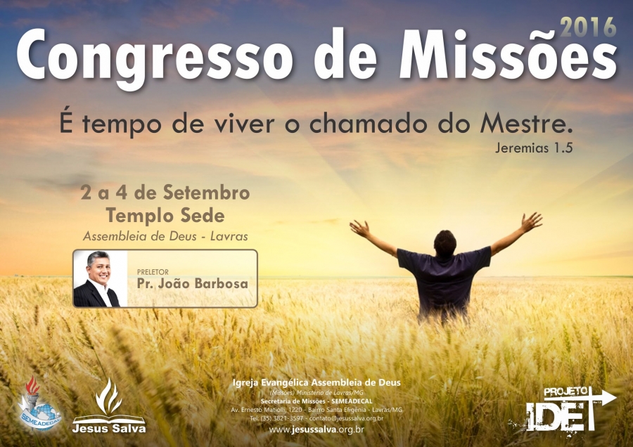 A Secretaria de Missões da Igreja (Semeadecal) convida todos a participar do Congresso de Missões 2016. O tema, baseado em Jeremias 1:5, é: "É tempo de viver o chamado do Mestre". O evento ocorrerá nos dias 2, 3 e 4 de setembro no Templo Sede, Lavras/MG, e terá como preletor o Pr. João Barbosa.