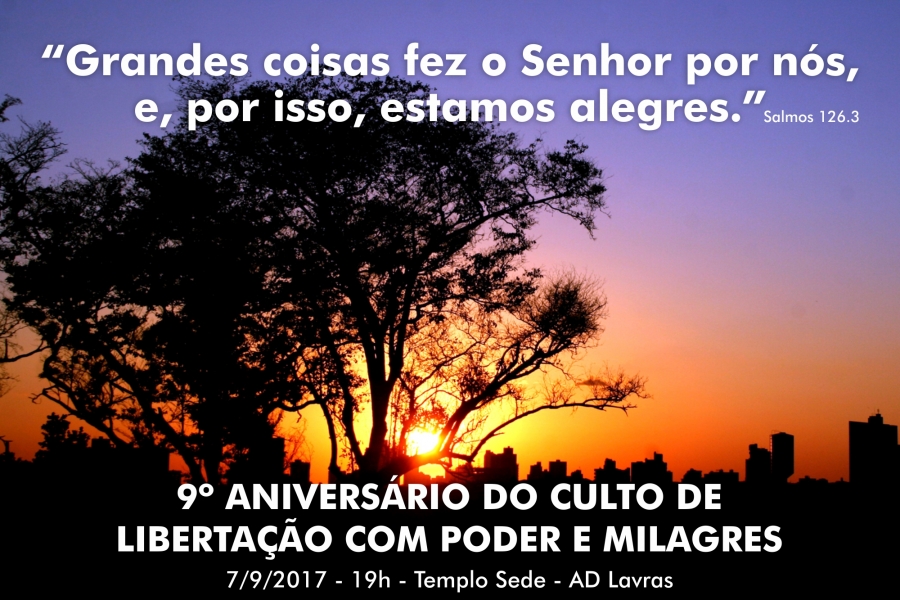 Escrito por Heider AlvarengaAcontecerá no próximo dia 7 de setembro às 19h no Templo Sede o Culto em Ação de Graças pelo 9º Aniversário do Culto de Libertação com Poder e Milagres.