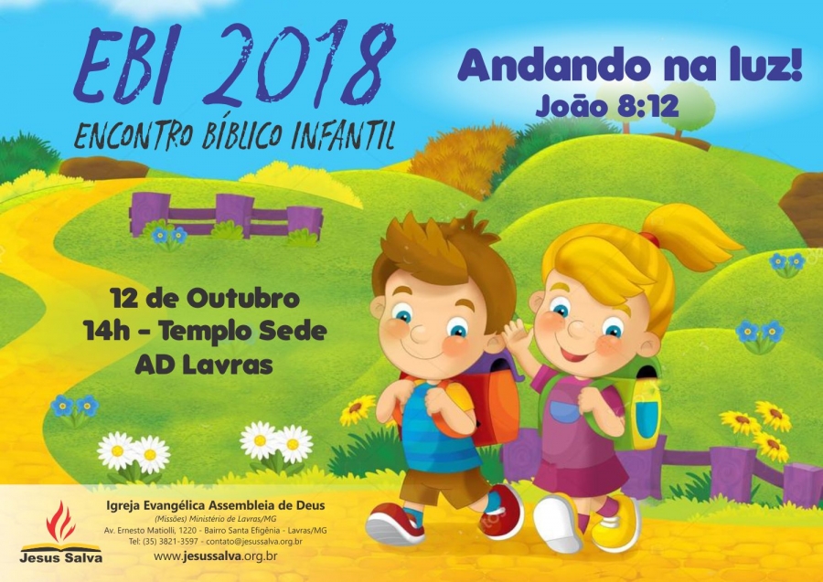 Escrito por Heider AlvarengaSerá realizado na próxima sexta-feira (12/10/2018), feriado e dia das crianças, o Encontro Bíblico Infantil - EBI 2018 às 14h no Templo Sede da Assembleia de Deus em Lavras/MG.