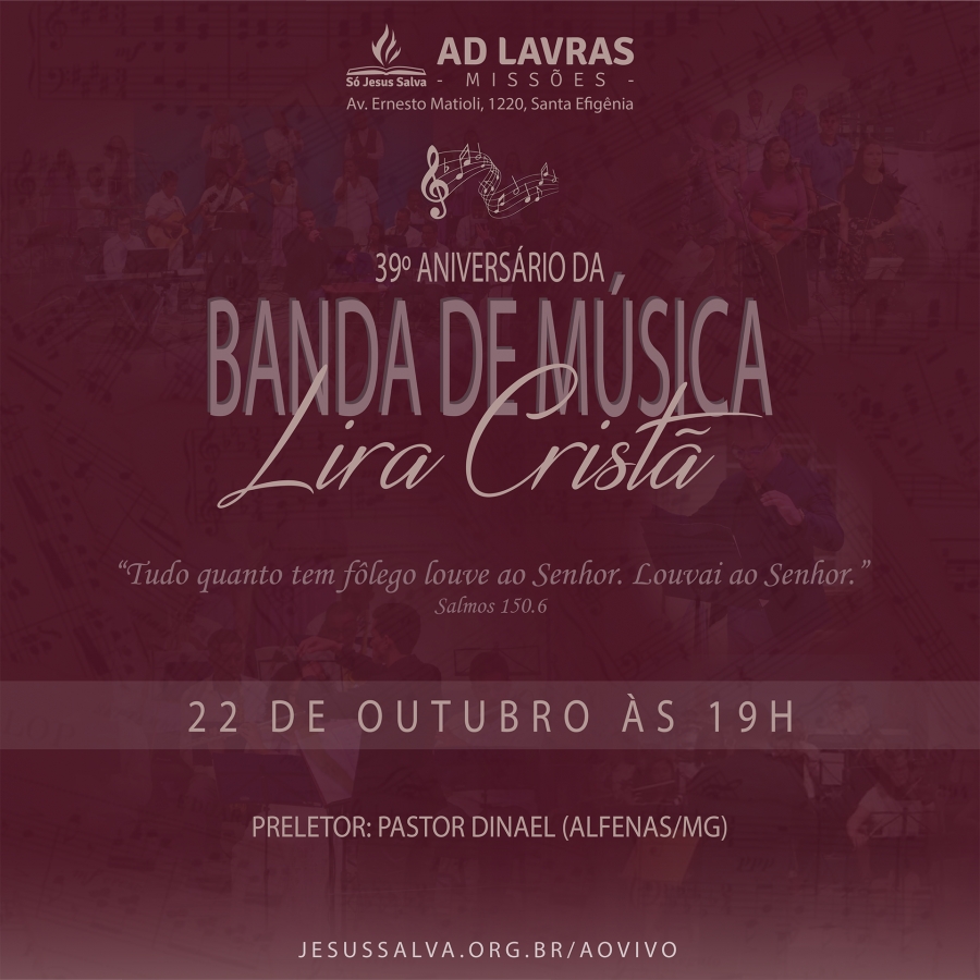 Escrito por Heider AlvarengaA Banda de Música Lira Cristã, da AD Lavras, completa, em 2022, 39 anos desde a sua fundação. Um culto em ação de graças será realizado no próximo sábado (22 de outubro), às 19h, no Templo Sede da AD Lavras. O preletor convidado é o pastor Dinael de Alfenas/MG.