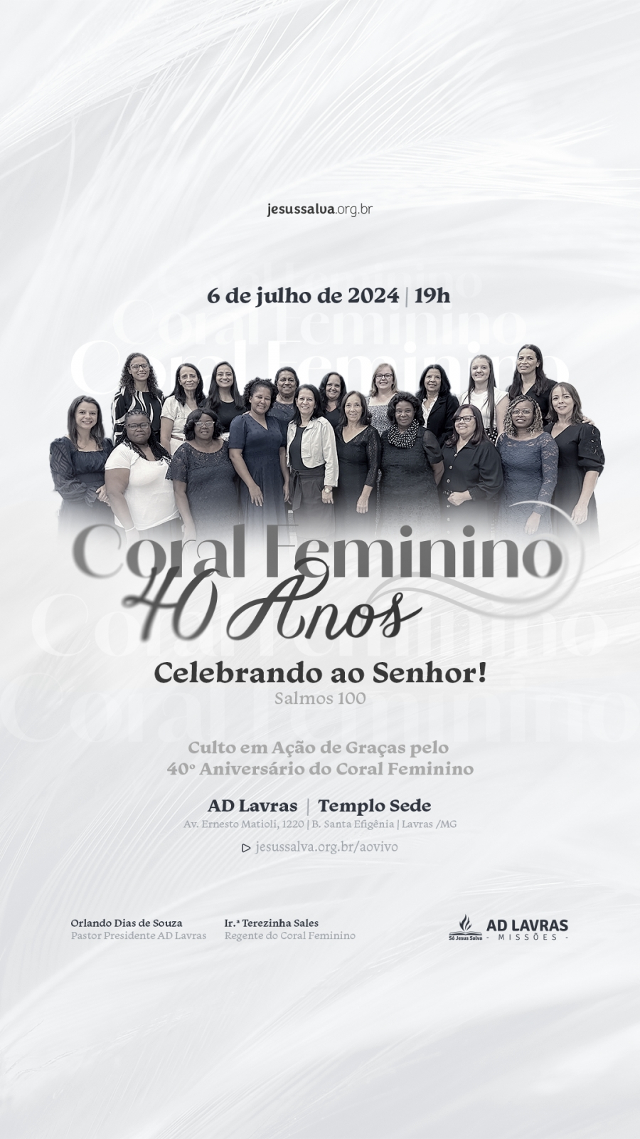 A regente do Coral Feminino Ir.ª Terezinha Sales e o pastor presidente Orlando Dias de Souza convidam a todos a celebrar esse momento especial do ministério de louvor da nossa Igreja.