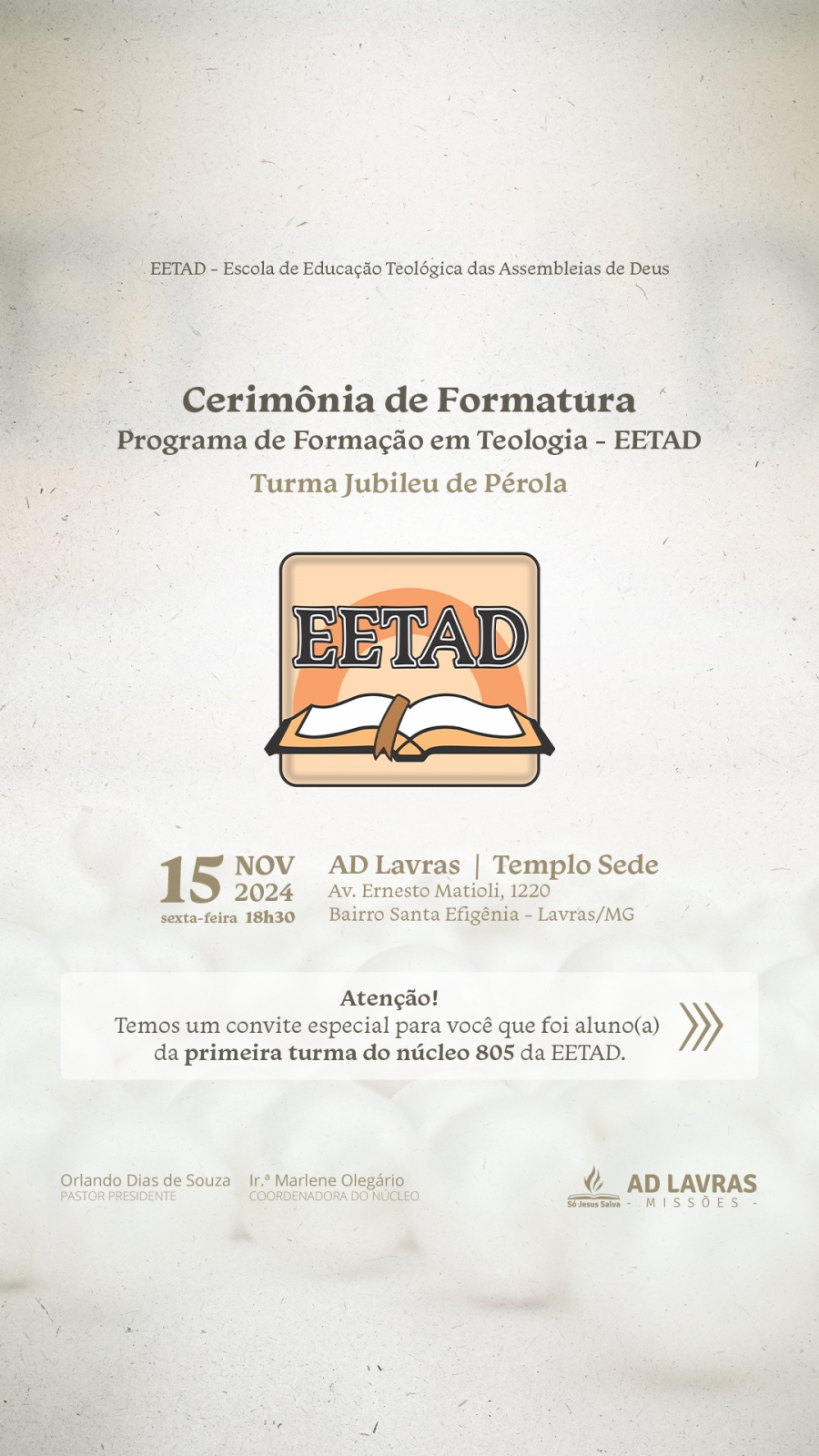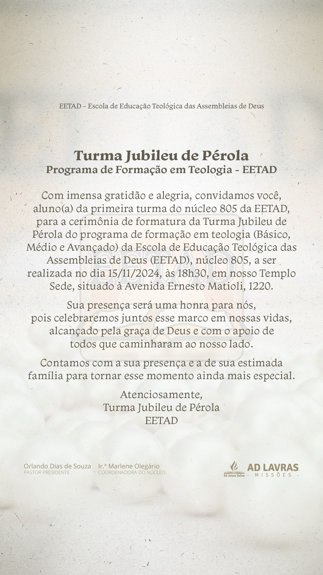Temos um convite especial para você que foi aluno(a) da primeira turma do núcleo 805 da EETAD. Com imensa gratidão e alegria, convidamos você, aluno(a) da primeira turma do núcleo 805 da EETAD, para a cerimônia de formatura da Turma Jubileu de Pérola do programa de formação em teologia (Básico, Médio e Avançado) da Escola de Educação Teológica das Assembleias de Deus (EETAD), núcleo 805, a ser realizada no dia 15/11/2024, às 18h30, em nosso Templo Sede, situado à Avenida Ernesto Matioli, 1220.