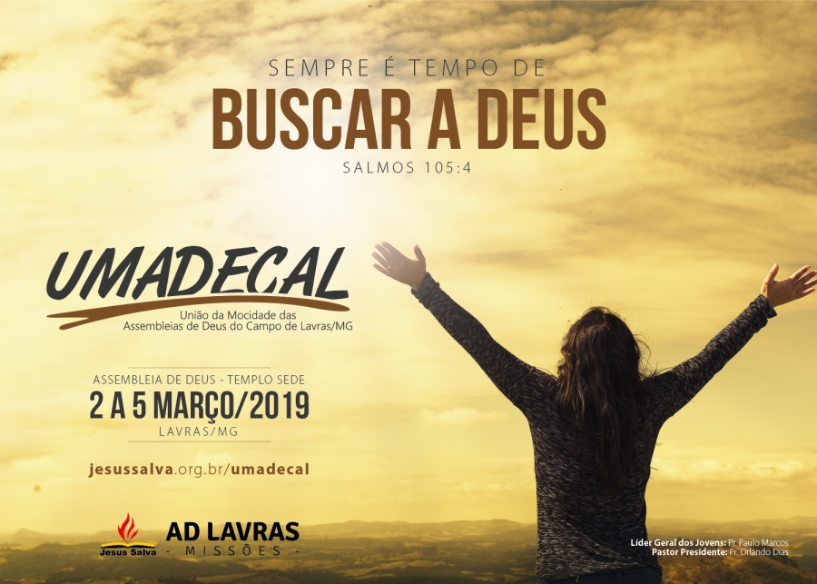 Acontece em Lavras no período de Carnaval, 2 a 5 de março, a Umadecal 2019 (União da Mocidade das Assembleias de Deus do Campo de Lavras). O congresso, que reunirá todos os jovens do Campo de Lavras, ocorrerá no Templo Sede com uma programação direcionada a atender a realidade dos jovens e sua vida cristã.