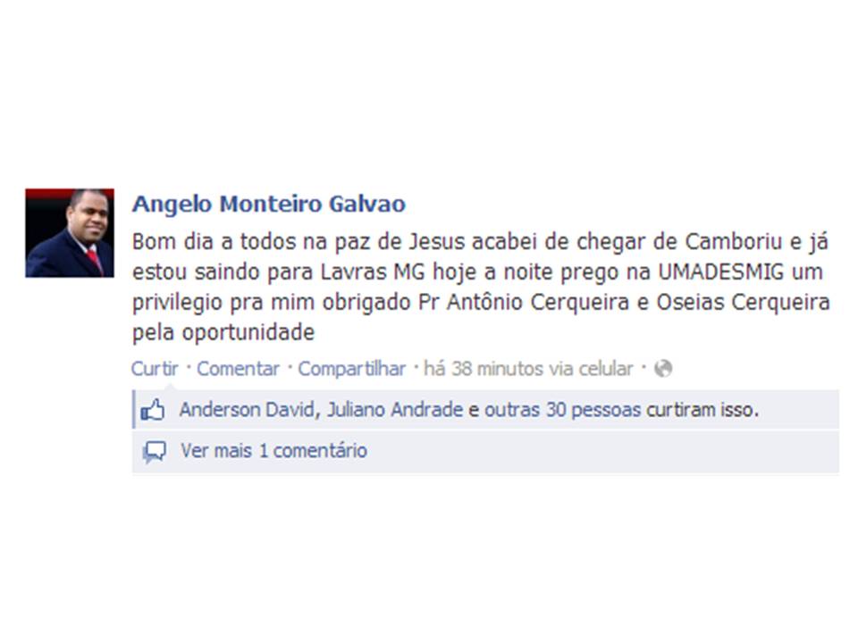 Através de rede social (foto)  o Pastor Ângelo confirmou que está seguindo para a cidade de Lavras e agradeceu ao Pastor Antonio Cerqueira e a Oseias Cerqueira pela oportunidade.